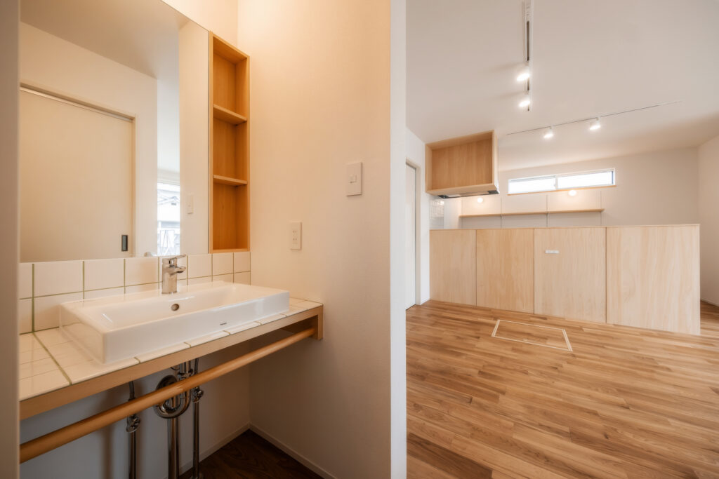 シナ材の柔らかな質感を活かした洗面台は、白いタイルと木枠で上品に構成。見せる収納と機能美を両立させました。