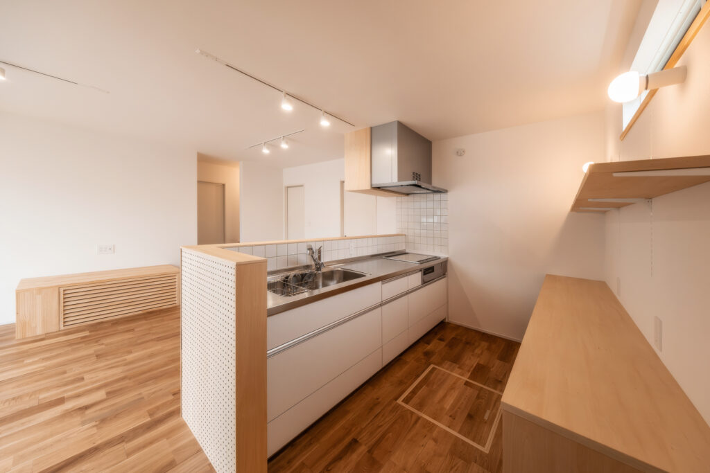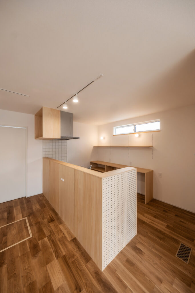 家族の憩いの場を象徴します。キッチンカウンターには有孔ボードを採用。ボタニカルな雑貨を飾るなど、